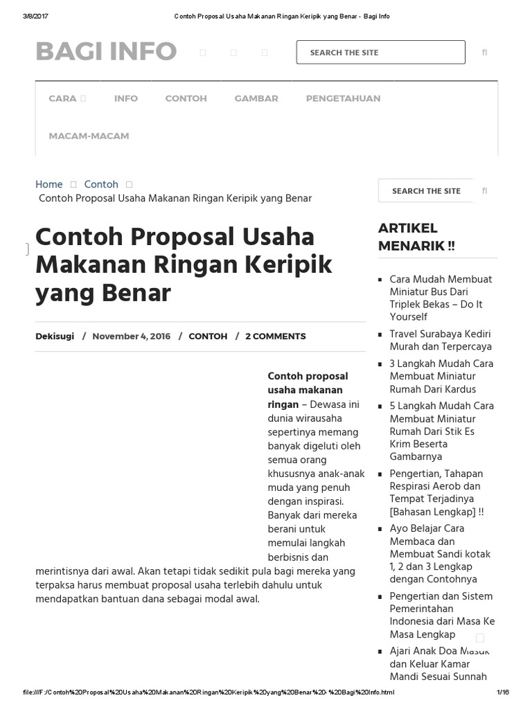 Proposal usaha berkaitan dengan banyak faktor, seperti analisis swot, modal, detil produk atau jasa yang akan dijual. Berikut ini contoh proposal usaha makanan yang coba saya berikan pada anda. Contoh proposal usaha makanan a.pendahuluan latar belakang pada saat ini banyak orang yang ingin membuat acara atau kegiatan secara simpel dan efisien. Beberapa elemen mungkin bisa anda sesuaikan dengan kebutuhan karena tidak ada format yang baku. Dalam artikel edisi kali ini, paper.id akan membagikan 3 contoh proposal usaha untuk usaha makanan, minuman dan usaha sepatu.